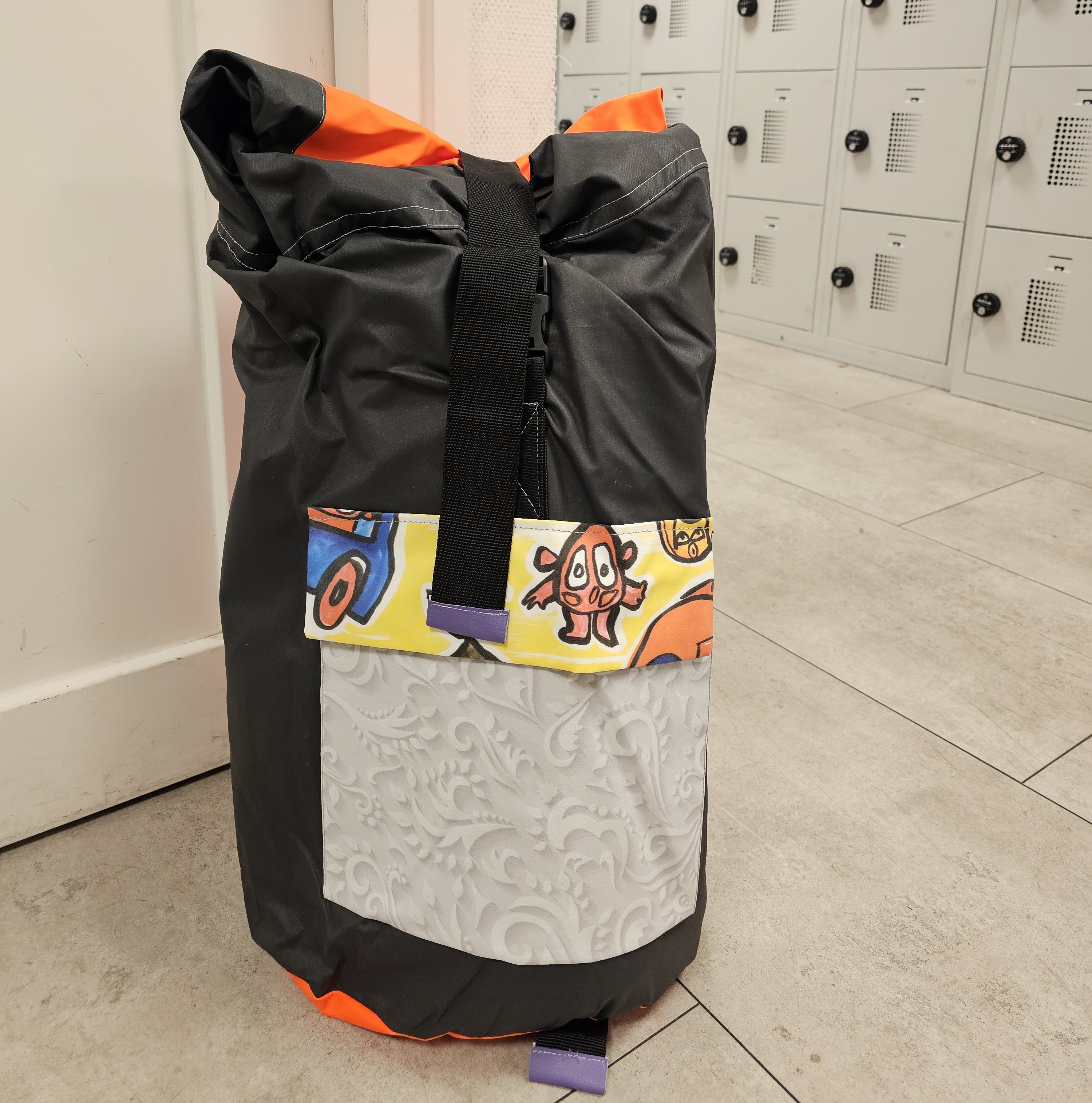De tas kan uitgevouwen worden tot een waterdicht pak, dat aangetrokken kan worden zodat men warm en droog kan liggen.